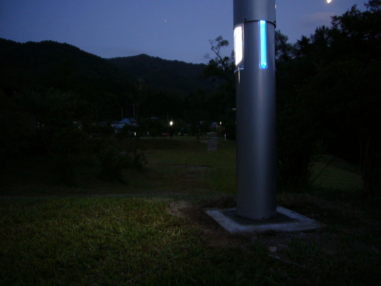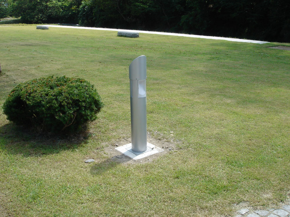 | 施設概要 | 上部に2.03Wの太陽光モジュールを備え、内部に2重層コンデンサ(キャパシタ)を備えた独立型。昼間の電力をキャパシタに蓄積し夜間にLEDライトを点灯させる仕組みで、蓄電による点灯時間は約14時間です。これが公園内に8基設置されています。 |